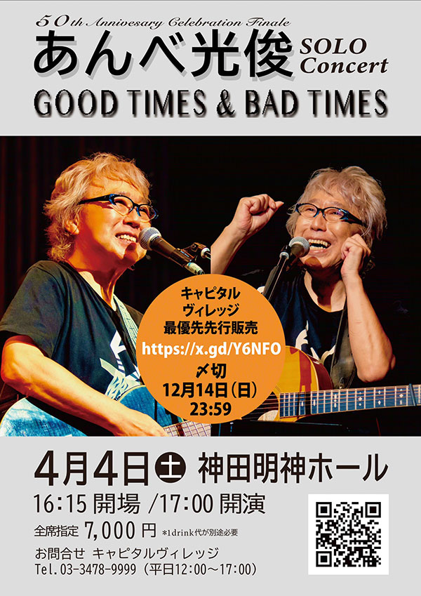 LIVE SCHEDULE>デビュー50周年記念ファイナル-あんべ光俊 ソロコンサート “Good Times & Bad Times”神田明神ホール>
